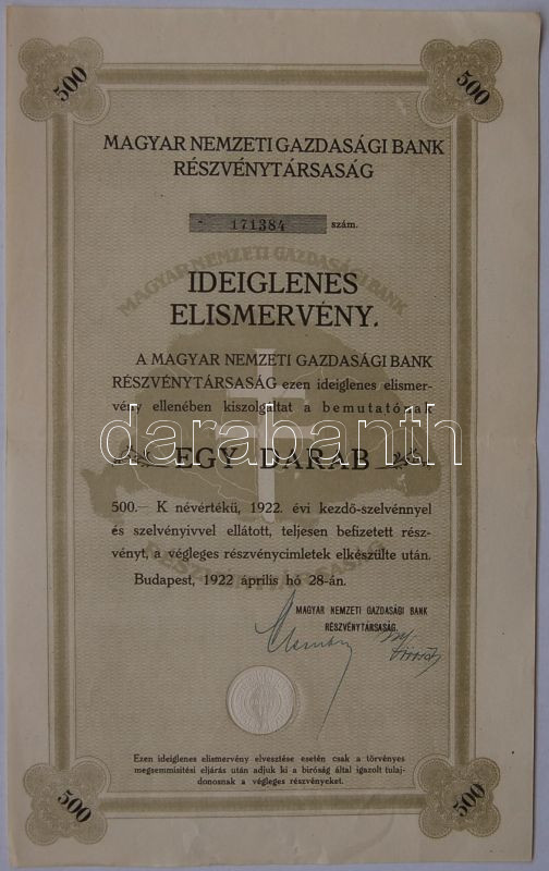 1922 Magyar Nemzeti Gazdasági Bank Ideiglenes elismervény / Provisoris... https://www.darabanth.com/hu/3-Nagyaukcio/3.1/Numizmatika/Tortenelmi-ertekpapirok-Historische-Wertpapiere~899/1922-Magyar-Nemzeti-Gazdasagi-Bank-Ideiglenes-elismerveny-Provisorische-Quittung~II67729