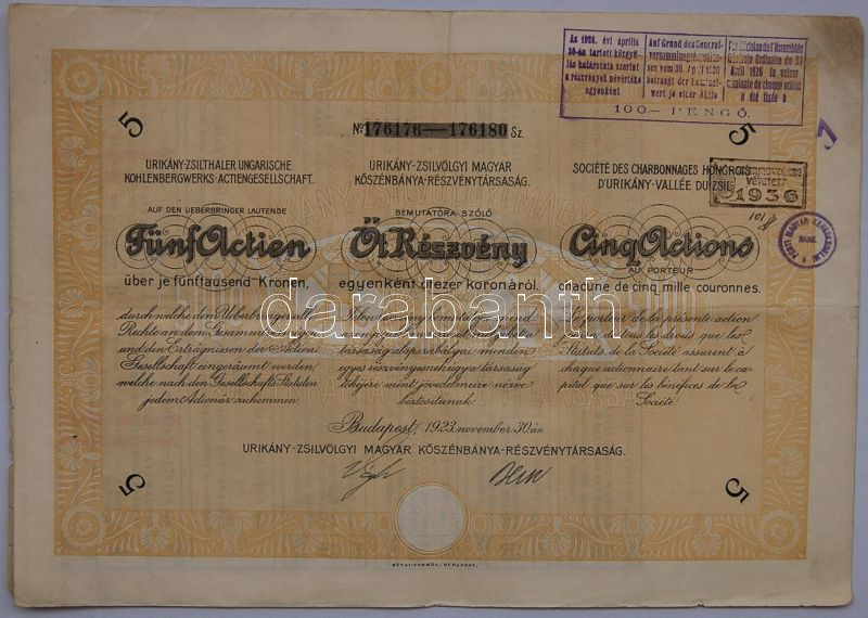 1923 Urikány-Zsilvölgyi Magyar kőszénbánya Rt. 5x5000K részvény / Kohl... https://www.darabanth.com/hu/3-Nagyaukcio/3.1/Numizmatika/Tortenelmi-ertekpapirok-Historische-Wertpapiere~899/1923-Urikany-Zsilvolgyi-Magyar-koszenbanya-Rt-5x5000K-reszveny-Kohlbergwerks-AG-Aktie~II67735