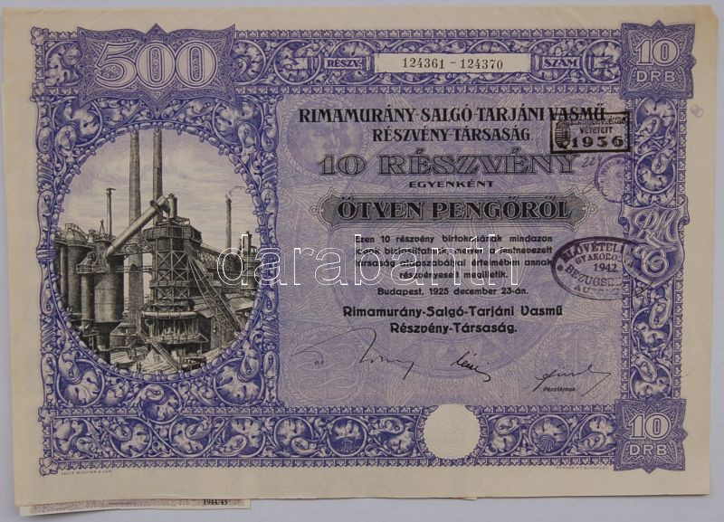 1925 Rimamurányi-Salgó-Tarjáni Vasmű Rt. 10x50P részvény / Eisenwerken... https://www.darabanth.com/hu/3-Nagyaukcio/3.1/Numizmatika/Tortenelmi-ertekpapirok-Historische-Wertpapiere~899/1925-Rimamuranyi-Salgo-Tarjani-Vasmu-Rt-10x50P-reszveny-Eisenwerken-Aktie~II67741