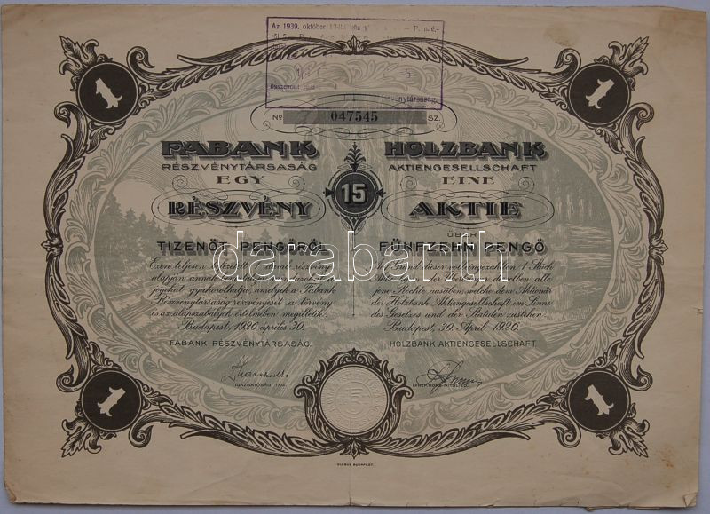 1926 Fabank Rt. 15P részvény / Holzbank AG Aktie https://www.darabanth.com/hu/3-Nagyaukcio/3.1/Numizmatika/Tortenelmi-ertekpapirok-Historische-Wertpapiere~899/1926-Fabank-Rt-15P-reszveny-Holzbank-AG-Aktie~II67717