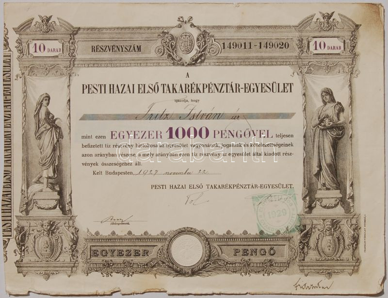 1927 Pesti Hazai Első Takarékpénztár-Egyesület 1000p részvény / Sparka... https://www.darabanth.com/hu/3-Nagyaukcio/3.1/Numizmatika/Tortenelmi-ertekpapirok-Historische-Wertpapiere~899/1927-Pesti-Hazai-Elso-Takarekpenztar-Egyesulet-1000p-reszveny-Sparkassen-Aktie~II67703