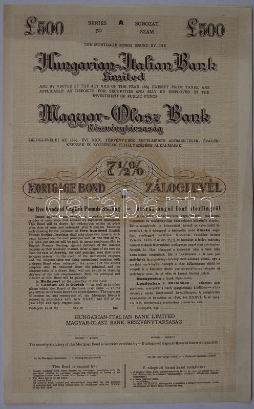 1928 Magyar Olasz Bank 500ł záloglevél / Pfandbrief https://www.darabanth.com/hu/3-Nagyaukcio/3.1/Numizmatika/Tortenelmi-ertekpapirok-Historische-Wertpapiere~899/1928-Magyar-Olasz-Bank-500C582-zaloglevel-Pfandbrief~II67677