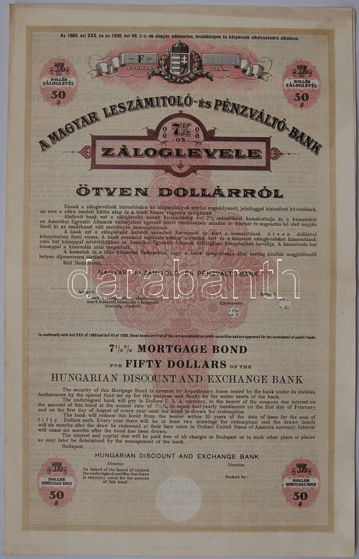 1928 Magyar leszámítoló és Pénzváltó Bank 50$ záloglevél / Pfandbrief https://www.darabanth.com/hu/3-Nagyaukcio/3.1/Numizmatika/Tortenelmi-ertekpapirok-Historische-Wertpapiere~899/1928-Magyar-leszamitolo-es-Penzvalto-Bank-50USD-zaloglevel-Pfandbrief~II67675