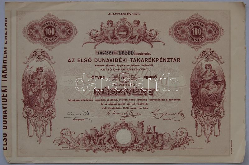 1930 Első Dunavidéki Takarékpénztár 100P részvény / Sparkassenaktie https://www.darabanth.com/hu/3-Nagyaukcio/3.1/Numizmatika/Tortenelmi-ertekpapirok-Historische-Wertpapiere~899/1930-Elso-Dunavideki-Takarekpenztar-100P-reszveny-Sparkassenaktie~II67701