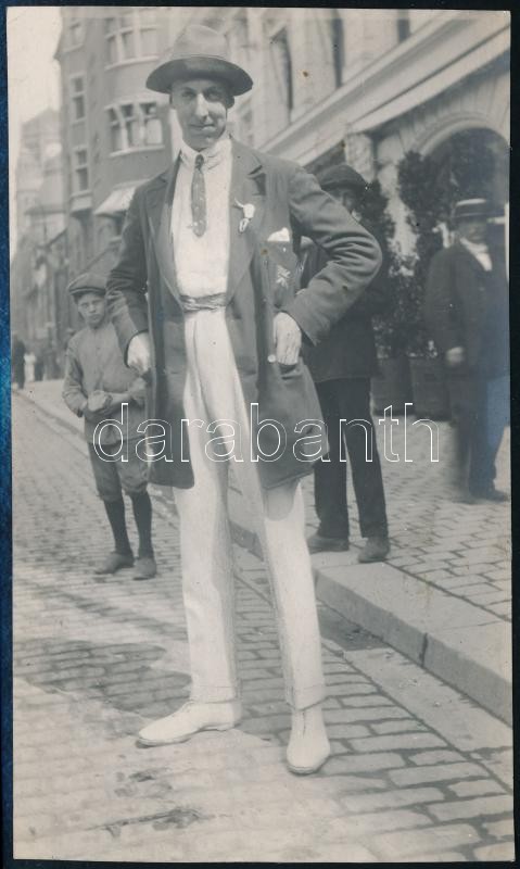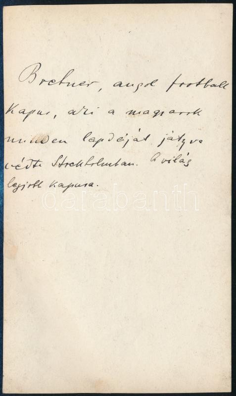 1912 Ronald Brebner (1881-1914) a stockholmi olimpián aranyérmes angol futballcsapat kapusa a stockholmi utcán, hátoldalon feliratozott fotó, 14×8 cm / 1912 Stockholm, Ronald Brebner (1881-1914) English football player