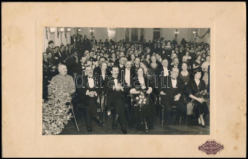 1934 Budapest, MOVE-bál, az első sorban Gömbös Gyula miniszterelnök, feliratozott, pecséttel jelzett fotó Schäffer Gy. műterméből, kartonra kasírozva, 11×17 cm