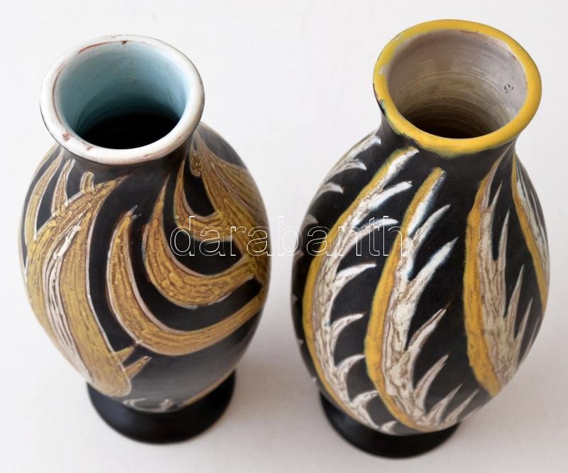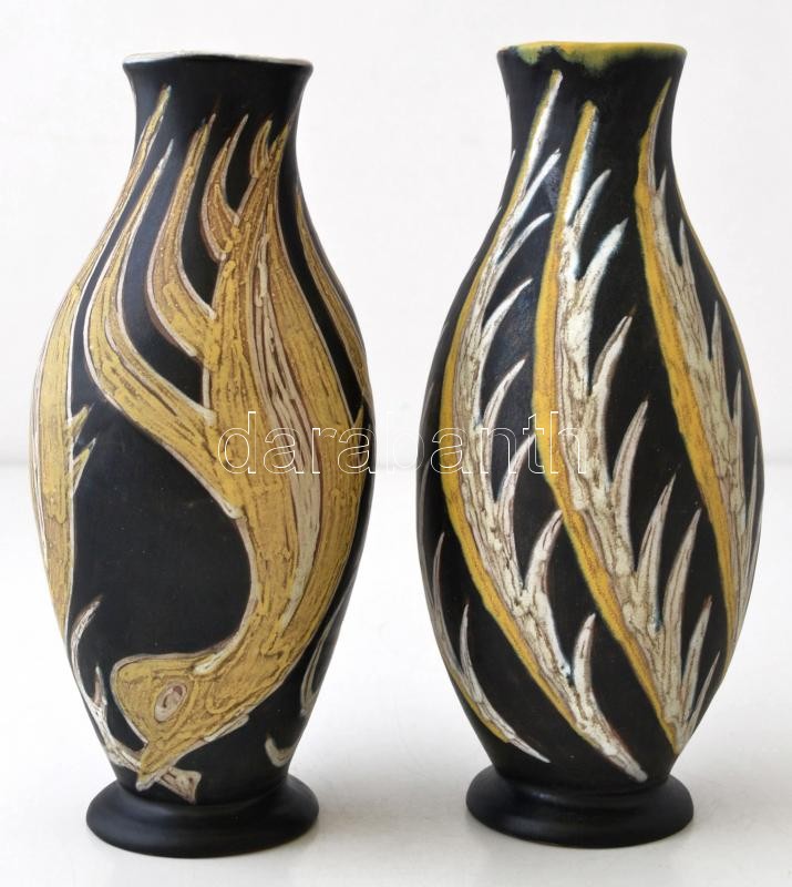 Leírás: Gorka Lívia (1925-2011): Madaras váza pár (2db). Festett, mázas kerámia, jelzett, egyiken apró máz hibákkal, m:23,5 cm (2×)