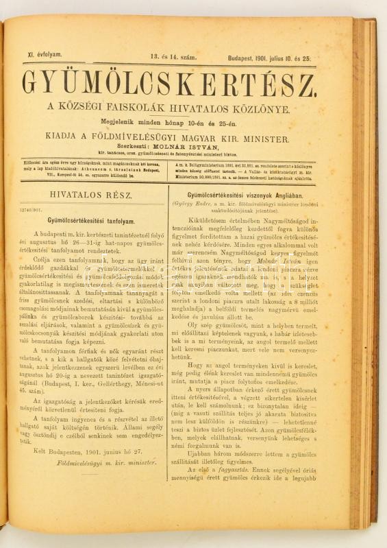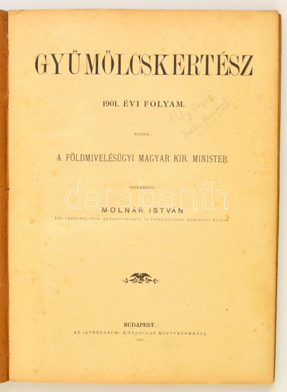 1901 Gyümölcskertész. XI. évf. 1-24. szám. Teljes évfolyam. Szerk.: Rudinai Molnár István. Bp.,1901, Athenaeum, VIII+206 p. Szövegközti és egészoldalas képekkel illusztrálva. Korabeli átkötött félvászon-kötés, színes műmelléklet nélkül.
