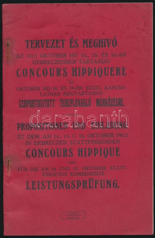 1913 Tervezet és meghívó a Debrecenben tartandó concours Hippiquere és... https://www.darabanth.com/hu/30-Nagyaukcio/30.1/Festmeny-mutargy-papirregiseg-egyeb/Nyomtatvanyok~12197/1913-Tervezet-es-meghivo-a-Debrecenben-tartando-concours-Hippiquere-es-csoportositott-tereplov~II1844247