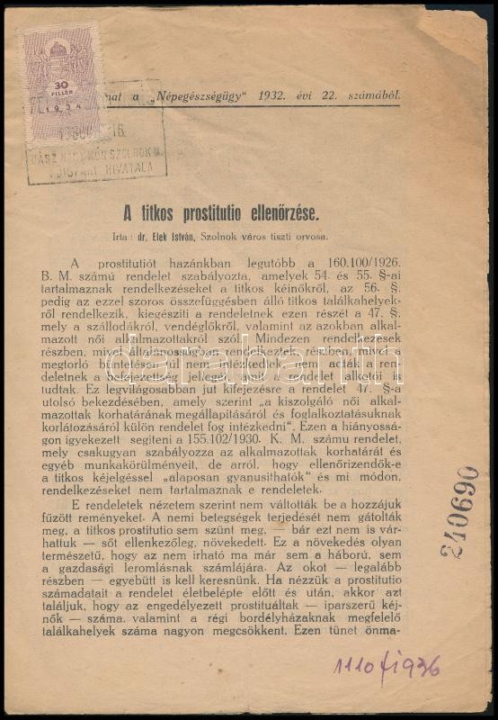 1932 Elek István: A titkos prostitutio ellenőrzése. Klny. a Népegészségügy 1932.évi 22. számából. Wachs Nyomdai Műintézet, Szolnok. Tűzött papírkötésben, okmánybélyeggel, kissé foltos, 8 p.