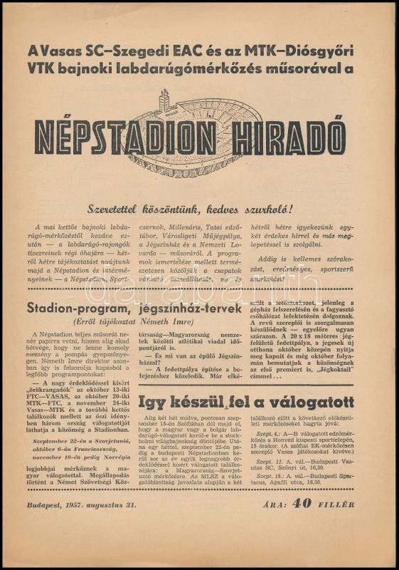 1957 a Népstadion híradó 1. lapszáma, érdekes írásokkal https://www.darabanth.com/hu/30-Nagyaukcio/30.1/Festmeny-mutargy-papirregiseg-egyeb/Nyomtatvanyok~12197/1957-a-Nepstadion-hirado-1-lapszama-erdekes-irasokkal~II1853762