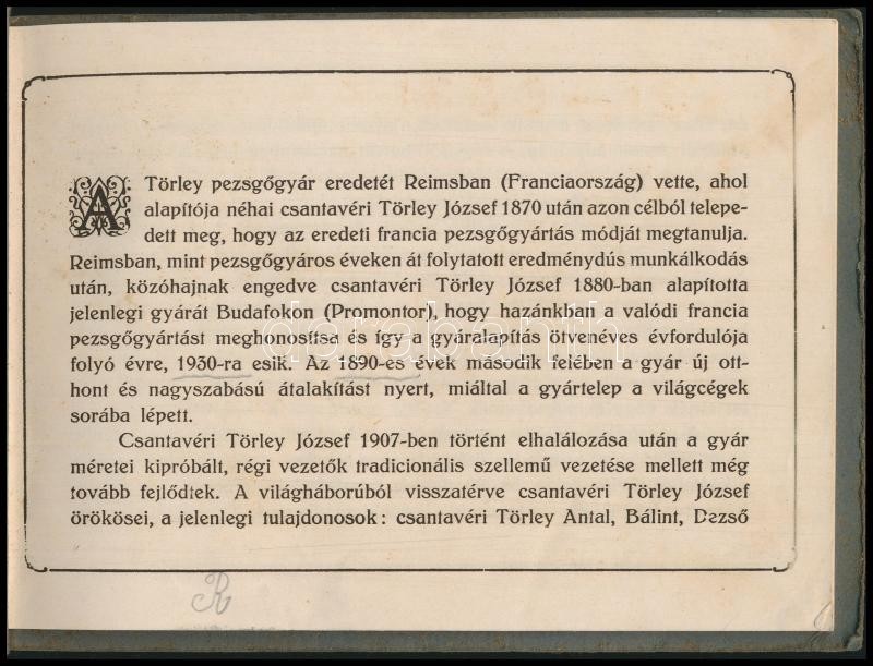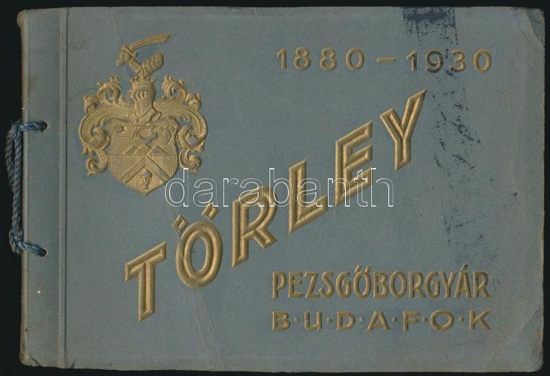 Törley Pezsgőborgyár Budafok 1880-1930. Bp.,(1930), Törley Pezsgőborgyár, (Monostory György-ny.), 32 sztl. lev. 51 fényképpel illusztrálva. Magyar, német és francia nyelvű bevezetővel és képfeliratozással. Kiadói zsinórfűzésű papírkötésben, a címlapon aranyozott, dombornyomású címfelirattal, címerrajzzal. A Törley Pezsőgborgyár 50 éves jubileumára kiadott exkluzív képeskönyv, jó állapotban. 18x13 cm