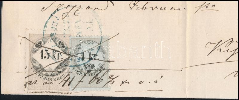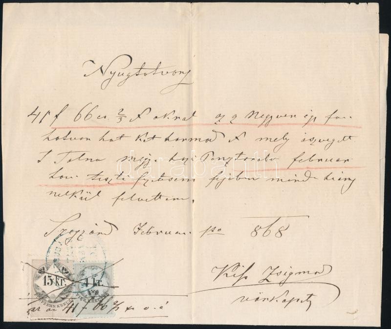 Leírás: 1868 Nyugtatvány Szekszárd. 1866 4 kr (MBK 122A, kékes) (36 000) + 15kr (fehér papírú)