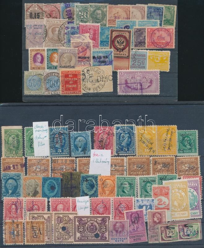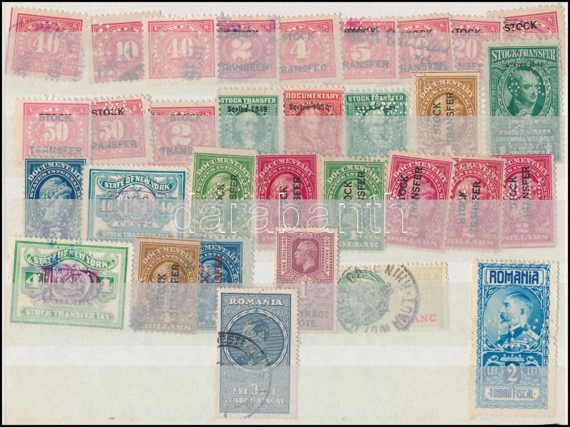 Leírás: 1890-től 110 db okmánybélyeg, főleg amerikai, 32 db perfin / 110 fiscal stamps, mostly USA, 32 perfin stamps