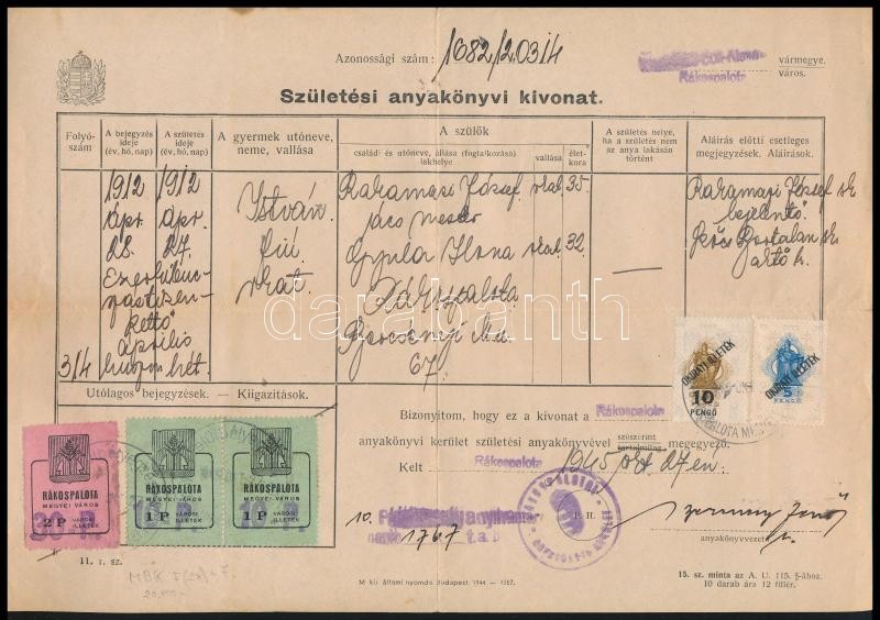 Leírás: 1945 Rákospalota születési anyakönyvi kivonat városi illetékbélyegekkel. Elcsúszott felülnyomással felülnyomott 1P és 2P. (30p+20P) + 10P+5P okirati illetékbélyeggel / City document stamps with shifted overprint.