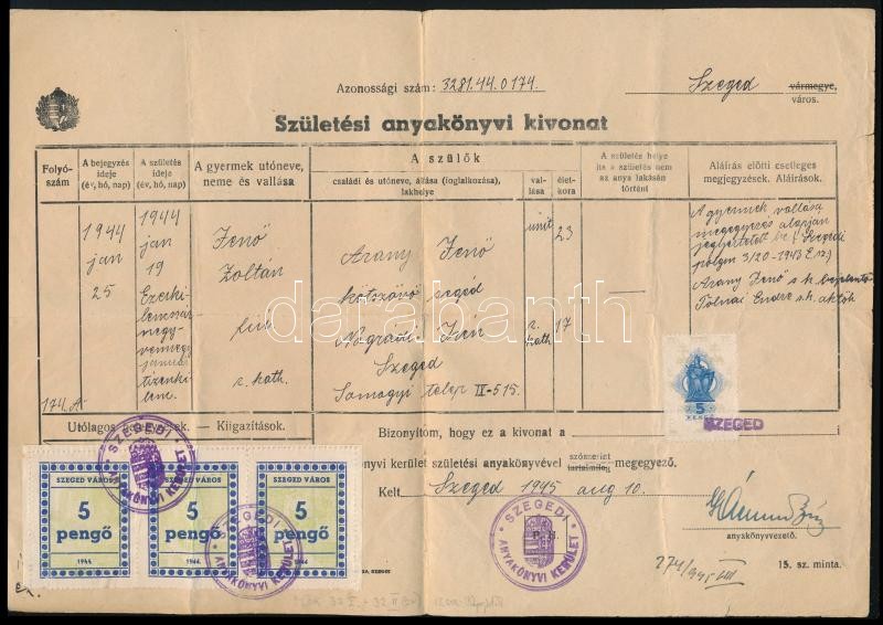 1945 Szeged 5P hármascsík városi illetékbélyegek . születési anyakönyv... https://www.darabanth.com/hu/30-Nagyaukcio/30.1/Festmeny-mutargy-papirregiseg-egyeb/Okmanybelyegek~12185/1945-Szeged-5P-harmascsik-varosi-illetekbelyegek-szuletesi-anyakonyvi-kivonaton-City-doc~II1858215
