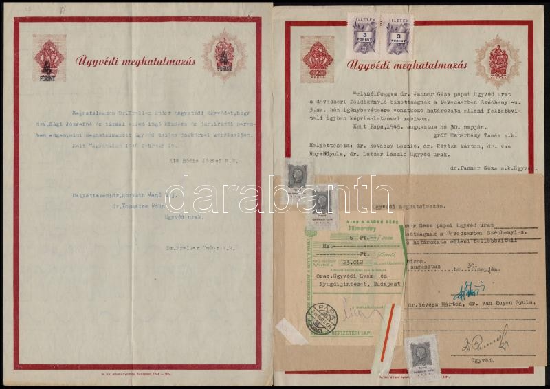 1946 aug. 30. 2P + 4f ügyvédi meghatalmazás 2x3Ft kiegészítéssel, 194... https://www.darabanth.com/hu/30-Nagyaukcio/30.1/Festmeny-mutargy-papirregiseg-egyeb/Okmanybelyegek~12185/1946-aug-30-2P-plus-4f-ugyvedi-meghatalmazas-2x3Ft-kiegeszitessel-1948-febr-19-4Ft-felulny~II1858267