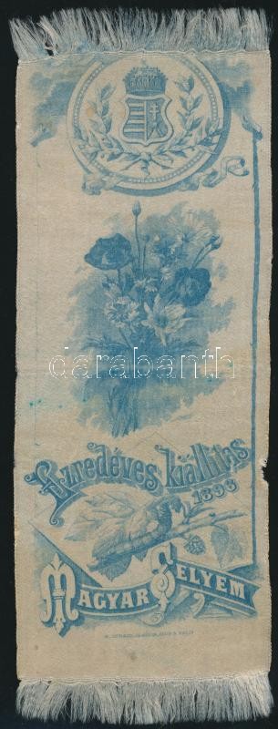 1896 Ezredéves kiállítás. Magyar selyem. Koronás magyar kiscímert, babérágakkal, valamint virágokat ábrázoló díszes selyem emléktárgy, az egyik szélen kis hiánnyal, 8,5 x 23,5 cm.