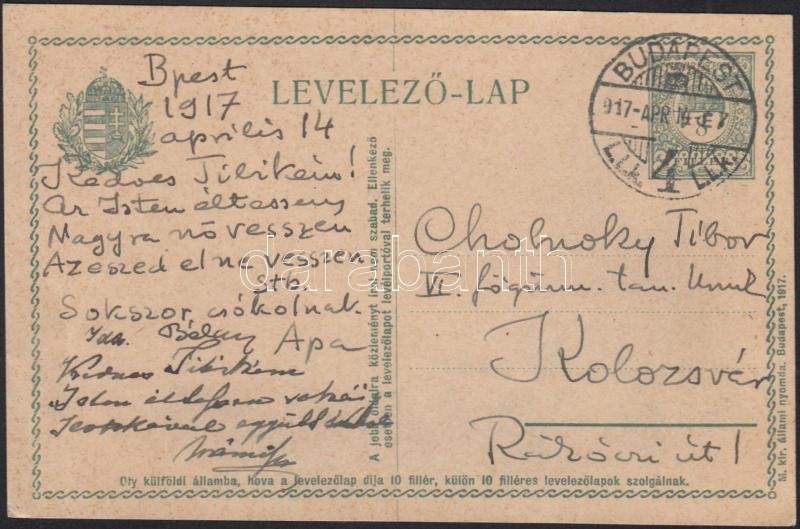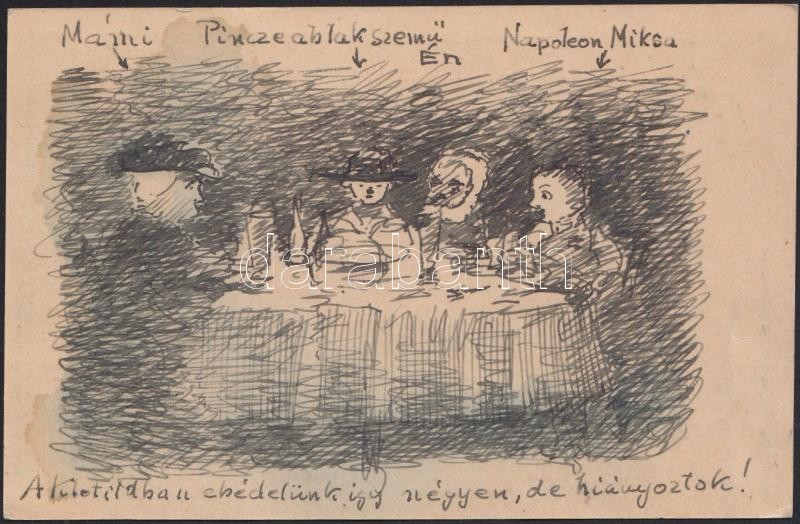1917 Cholnoky Jenő (1870-1950) földrajztudós saját kézzel írt sorai fiának, Cholnoky Tibornak (1901-1991) Budapestről küldött levelezőlapon, rajta Cholnoky Jenő későbbi második felesége, Fink Ida, másik fia, Béla és anyja, Zombath Krisztina aláírásával illetve üdvözlő soraival, a levelezőlap hátulján humoros rajzzal