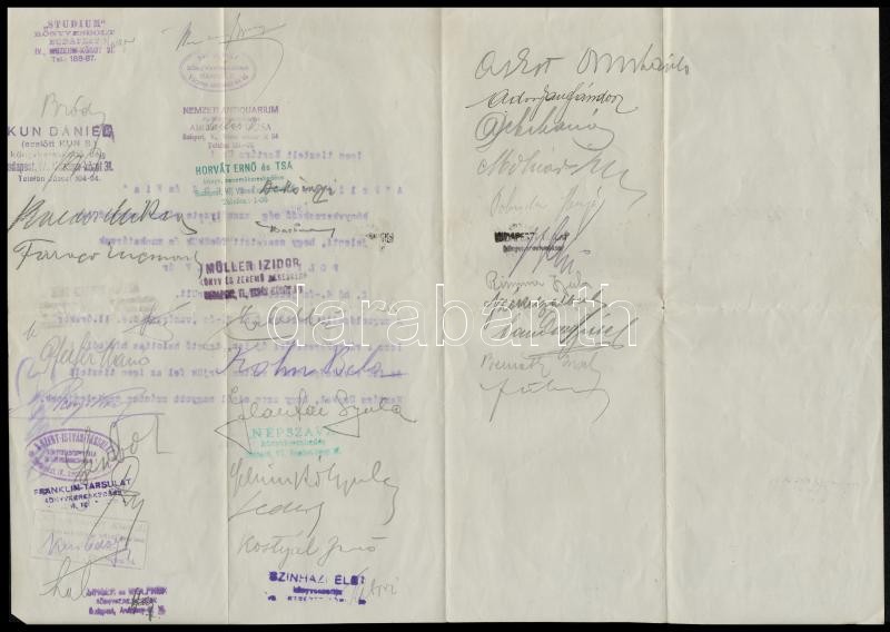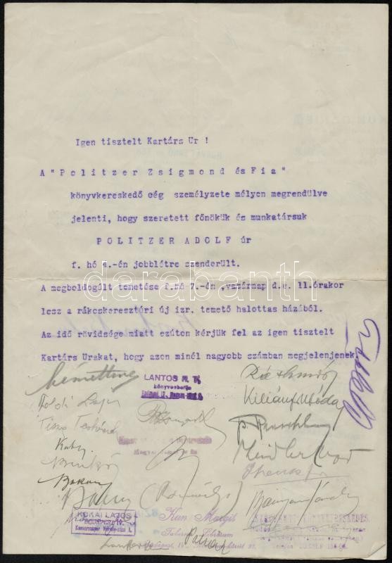 1932 Politzer Adolf (c.1863 - 1932) könyvkereskedÅ‘ halálozási értesÃtÅ‘je a többi könyvkereskedÅ‘ és antikvárius részére. A levélen az össze "kartárs" pecsétjével és aláÃrásaival