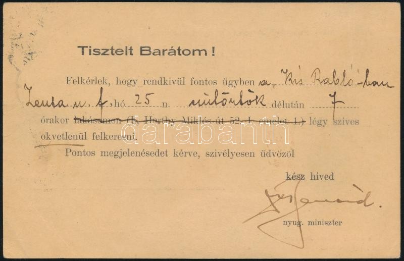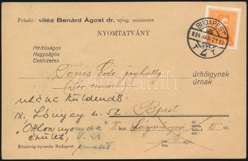 Leírás: 1934 Bernárd Ágost (1880-1968) politikus, korábbi miniszter, a trianoni békeszerződés egyik aláírójának levelezőlapja joghallgató részére