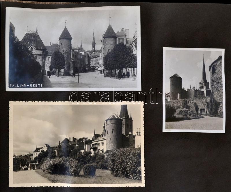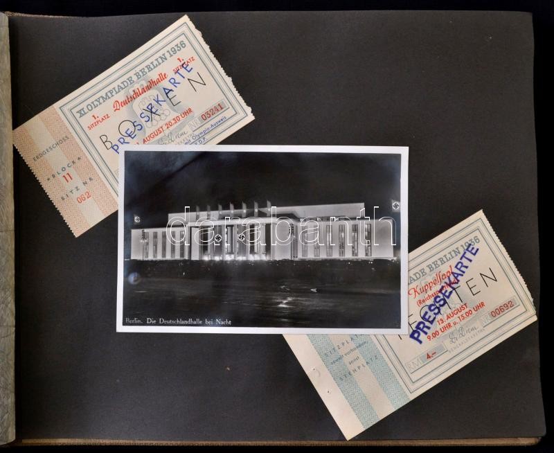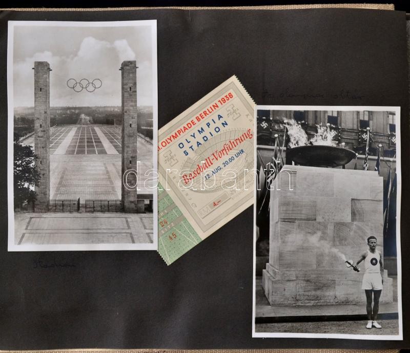 1936 A berlini olimpia relikviáiból összeállított album, az olimpiára kiadott képeslapokkal, térképekkel, 4 db belépőjeggyel, léghajó- és repülőgépfotóval, az album második részében észtországi képeslapokkal és térképpel / Album of the 1936 Summer Olympics, with postcards, photos, tickets and the photos of a travel in Estonia