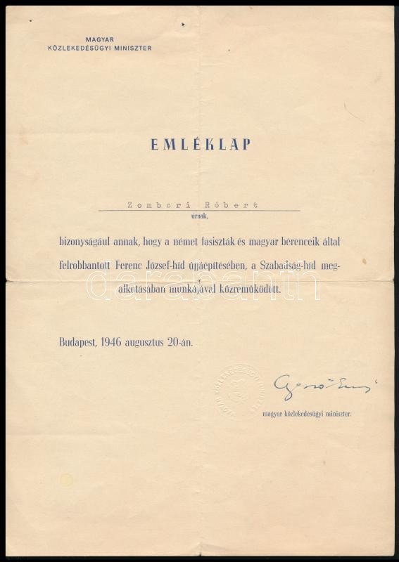 Leírás: 1946 Gerő Ernő (1898-1980) közlekedési miniszter aláírása a "Ferenc József híd újjáépítésében, a Szabadság híd megalkotásában" végzett munkáért
