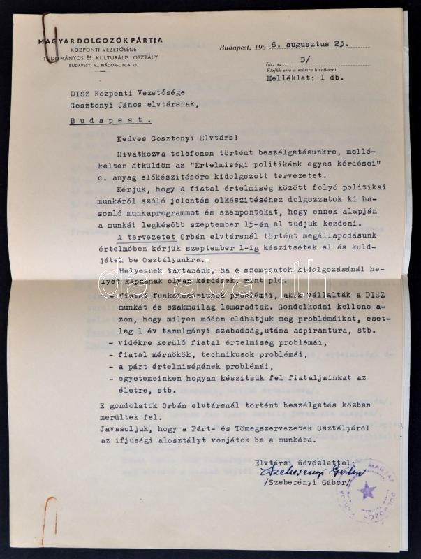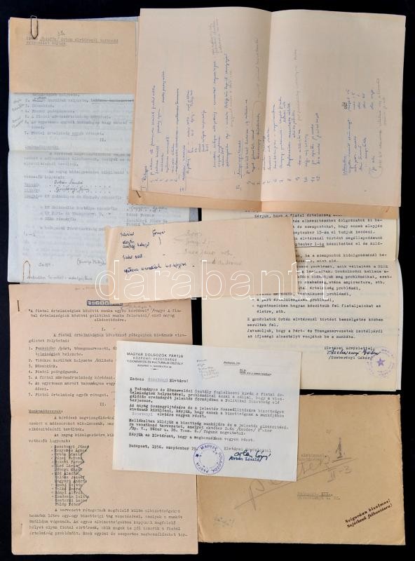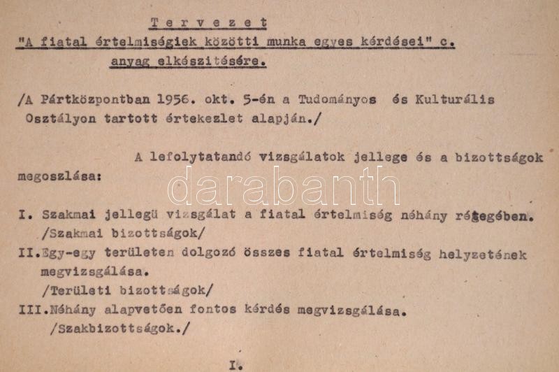 1956 Az MDP és a DISZ közös vizsgálata a fiatal értelmiségiek különböző csoportjainak helyzetére és hangulatára vonatkozóan. A tervezett vizsgálatokkal kapcsolatos különféle feljegyzések, javaslatok. Kb 20 kézzel és géppel beírt oldal