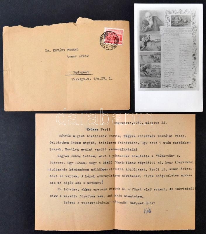 1957 Kittenberger Kálmán (1881-1958) Afrika-kutató, vadászÃró gépelt, aláÃrt levele Dr. Kovács Ferenc (?-?) tanár részére különféle személyes ügyekben, dedikált fotólappal, borÃtékban