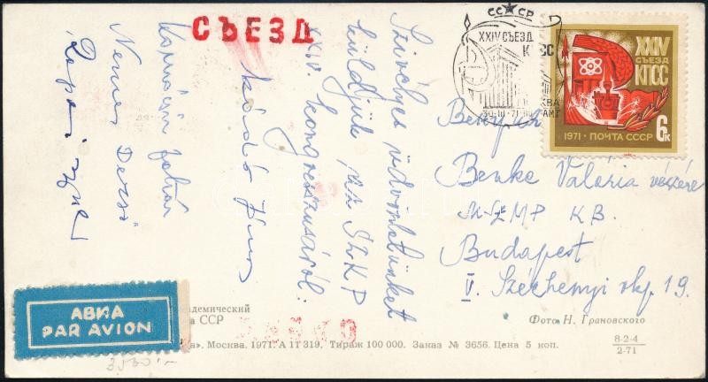 1971 Kádár János, Komócsin Zoltán, Nemes Dezső és Rapaics Rajmund saját kézzel aláírt BÚÉK képeslapja az SZKP XXIV. kongresszusáról Benke Valériának (1920-2009) művelődési miniszter KB tag, rádióelnök.