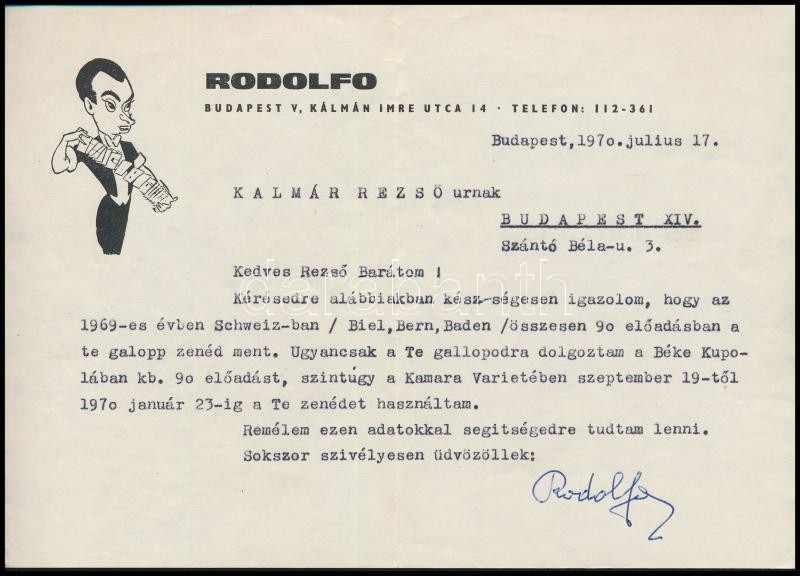 Leírás: 1975 Rodolfo (1911-1987) gépelt, aláírt levele Kalmár Rezső zeneszerzőnek, fejléces levélpapíron, borítékkal