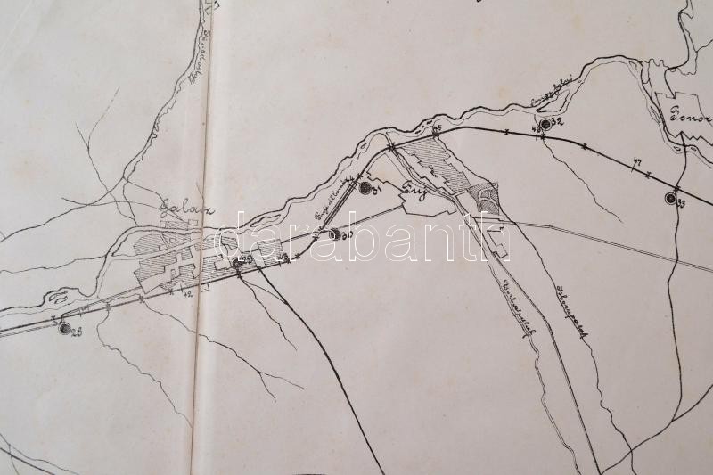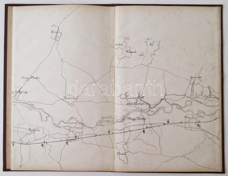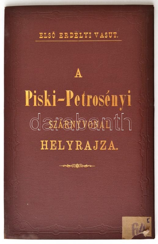 cca 1880 Első erdélyi vasút. A Piski-Petrozsényi szárnyvonal helyszínrajza. Nagyméretű, kihajtható tervrajz, az összes állomással. Aranyozott egészvászon kötésben. 252x34 cm / Plan of the first Transylvanian railways. Piski and Petrosany. Large plan in full linen binding 252 x 34 cm