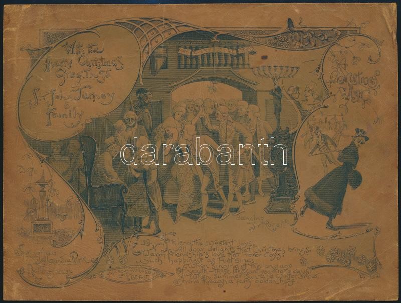 cca 1890 Karácsonyi üdvözlő grafika, vékony bőrön. With the Christmas greetings of Sir John Turney Family. felirattal és karácsonyi jelenettel / Christmas graphics on leather. With inscription "With the Christmas greetings of Sir John Turney Family." 20x15 cm