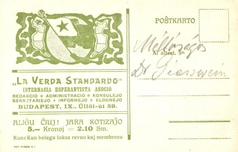 Leírás: Ludwik Lejzer Zamenhof (L. L. Zamenhof) as Dr. Esperanto. Creator of Esperanto. "La Verda Standardo" advertisement on the backside (EK)