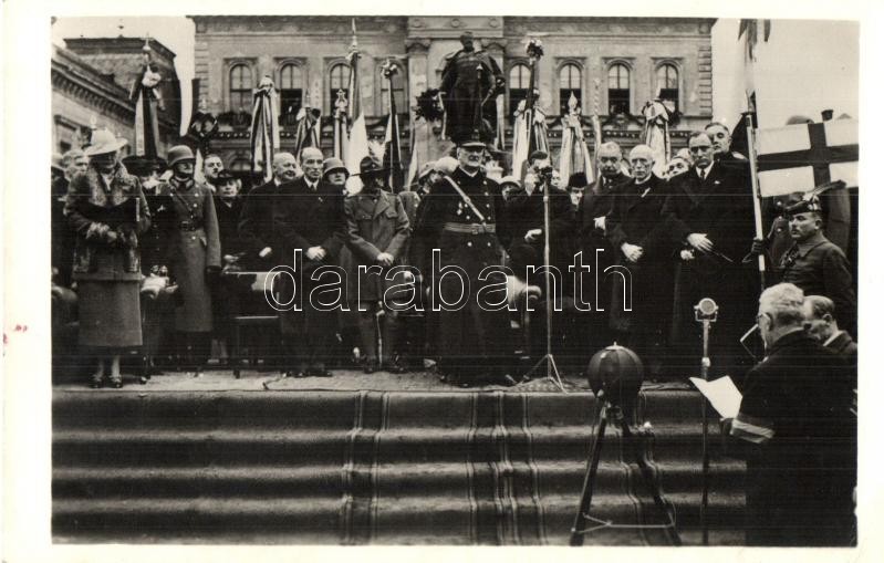 Leírás: 1938 Komárom, Komárnó; bevonulás, Horthy Miklós, Purgly Magdolna, Imrédy Béla, Teleki Pál / entry of the Hungarian troops. "1938 Komárom visszatért" So. Stpl