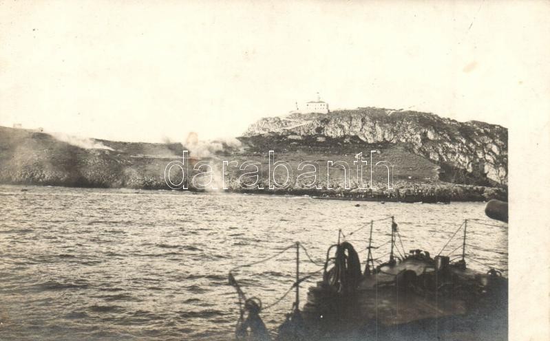 1915 Pelagosa, Palagruza; K.u.K. partraszállási akció Pelagosa szigeténél, a világítótorony bombázása. A felvételt az SMS Orjen torpedórombolóról készítették / K.u.K. Kriegsmarine's invasion of the island of Palagruza, bombardment of the lighthouse, SMS Orjen torpedo destroyer. photo