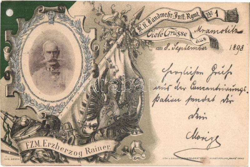 1898 F.Z.M. Erzherzog Rainer. Viele Grüsse aus K.k. Landwehr Inft. Rgmt. Nr. 1. / Archduke Rainer Ferdinand of Austria, K.u.k. military greeting art postcard. Art Nouveau, litho (EK)