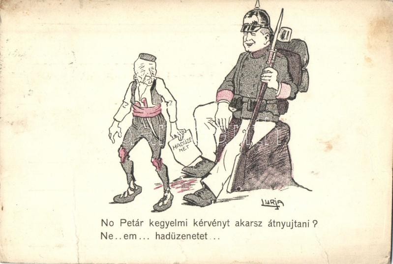 1914 Hadüzenet. No Petár kegyelmi kérvényt akarsz átnyújtani? Első világháborús szerb ellenes gúnyos propaganda lap / WWI anti-Serbian mocking art postcard with Peter I of Serbia s: Lurja (fa)