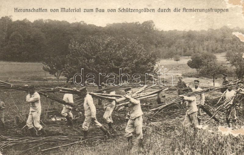 1915 Heranschaffen von Material zum Bau von Schützengräben durch die Armierungstruppen / WWI German military, collecting material for the construction of trenches by the reinforcements (Rb)