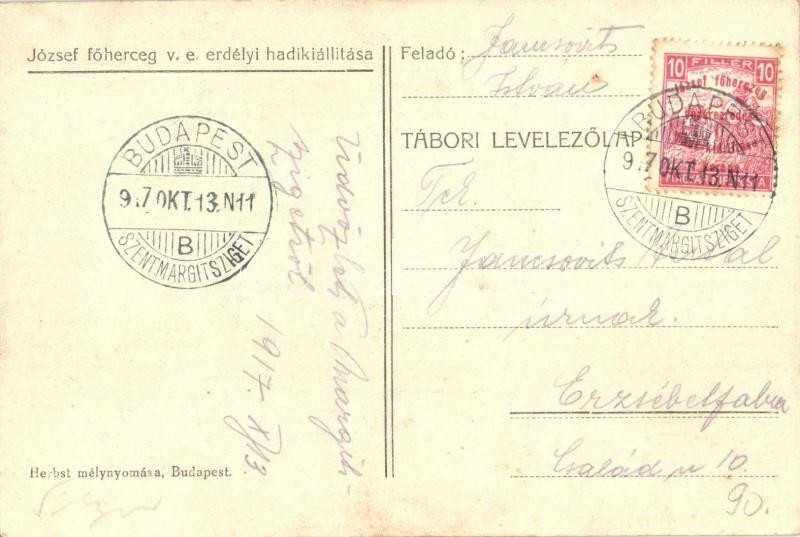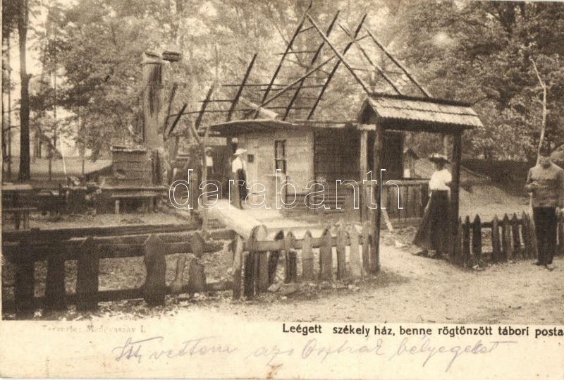 1917 Leégett székely ház, benne rögtönzött tábori posta. József főherceg v. e. erdélyi hadikiállítás / WWI K.u.K. military, burnt down Székely house with post office in it. So. Stpl