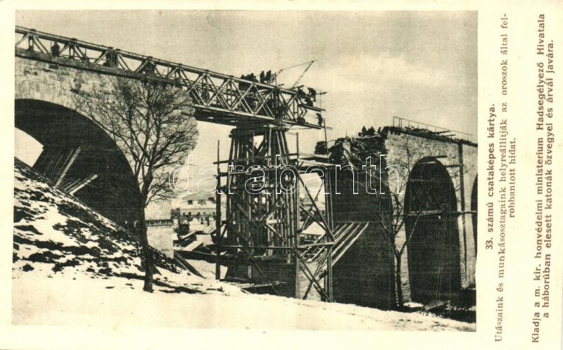 33. számú csataképes kártya. Utászaink és munkásosztagunk helyreállítja az oroszok által felrobbantott hidat. Hadsegélyező Hivatal kiadása / WWI K.u.K. military, soldiers reconstructing a bridge blown up by the Russians
