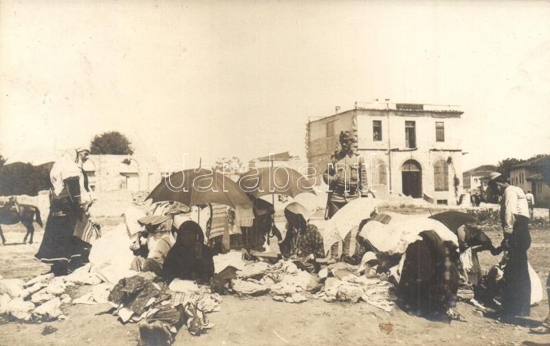 Leírás: ~1915 Kézimunka vásár Albániában osztrák-magyar katonával. Latzkovits Rezső tábori lelkész felvétele / WWI K.u.K. military, soldier in Albania at the market. photo