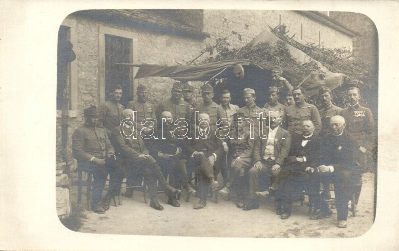 Leírás: Első világháborús katonai lap, méltóságok csoportképe álcázott sátor előtt / WWI K.u.K. military, dignitaries in front of a camouflaged tent. photo