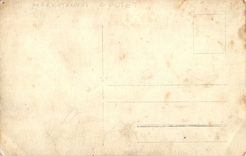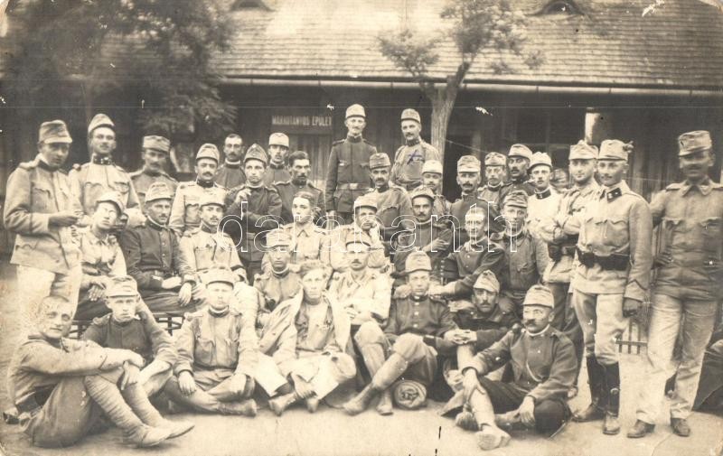 Első világháborús osztrák magyar katonai lap. Katonák csoportképe a Markotányos épület előtt / WWI K.u.k. military, soldiers' group in front of the Victualler building. photo (EK)
