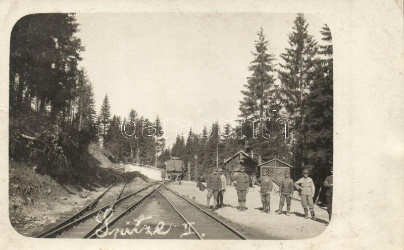 Első világháborús osztrák-magyar vasútállomás (Spitze II.) a Borsa-Priszlop-Jakobeny keskeny nyomtávolságú gőzüzemű tábori vasútvonalon az erdélyi hegyekben. Prislopbahn gőzmozdony és katonák / WWI K.u.K. military railway station (Spitze II.) of the Borsa-Prislop-Iacobeni narrow gauge steam powered field railroad in the Transylvanian mountains, soldiers and locomotive. photo