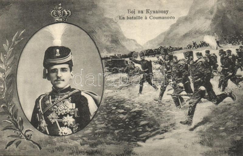 Leírás: La bataille a Coumanovo / Battle of Kumanovo. First Balkan War military art postcard. Alexander I of Yugoslavia
