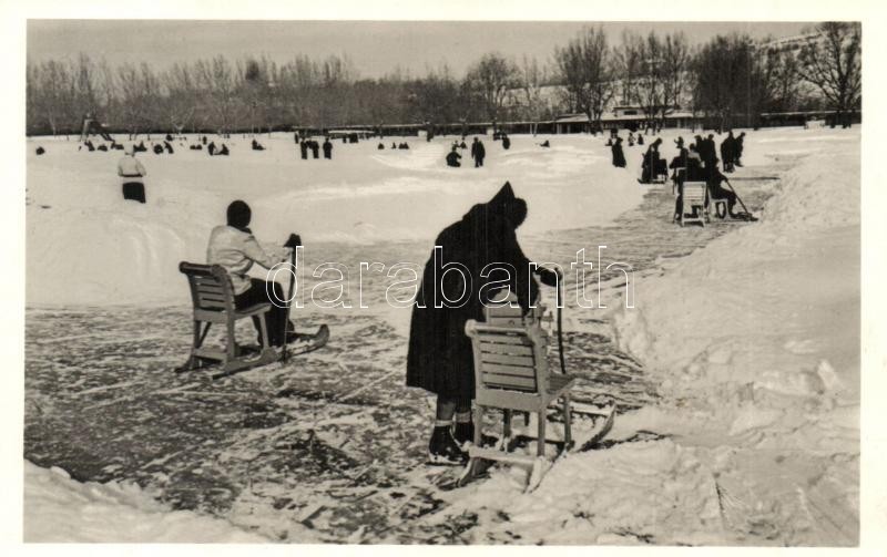 Leírás: Balatonkenese, Fakutyázás a Balatonon télen, téli sport. Dulovits Jenő felvétele