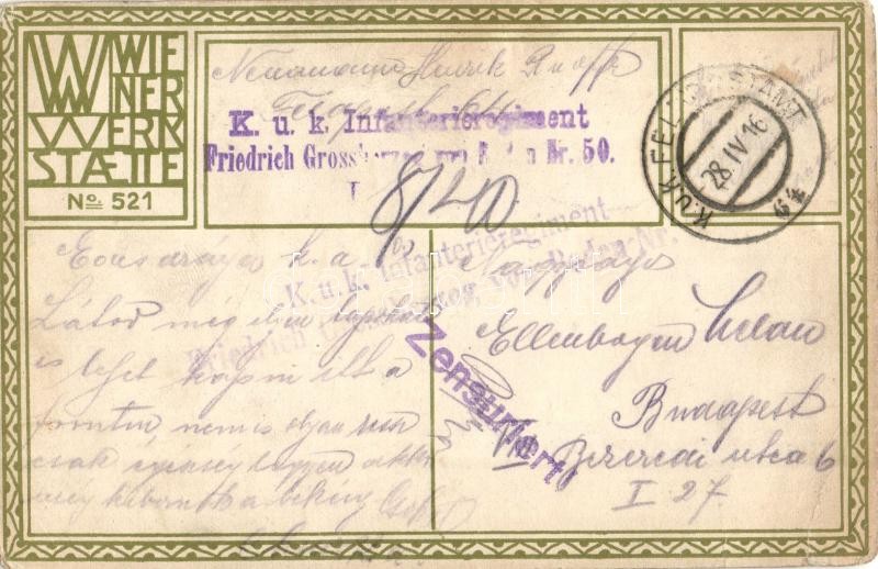 Leírás: 1916 Lady with Dachshunds, Wiener Werksätte No. 521. s: Mela Koehler + K.u.K. Infanterieregiment Friedrich Grossherzog von Baden Nr. 50. (fa)
