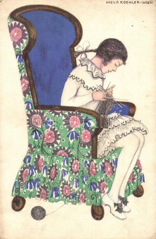 1917 Lady knitting. B.K.W.I. 364-6. s: Mela Koehler (fa) https://www.darabanth.com/hu/30-Nagyaukcio/30.1/Kepeslapok/Muveszlapok~12591/1917-Lady-knitting-BKWI-364-6-s-Mela-Koehler-fa~II1866055