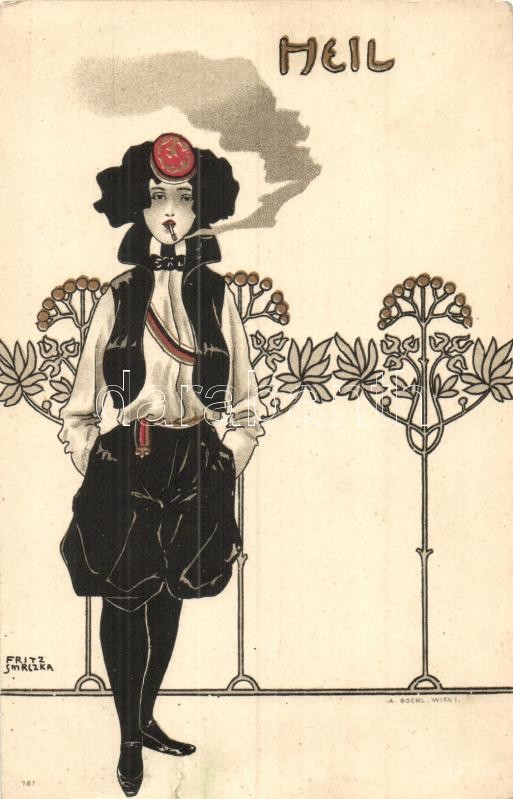 Leírás: Heil / Lady smoking a cigarette. Art Nouveau litho A. Sockl, Wien I. s: Fritz Smrczka (r)